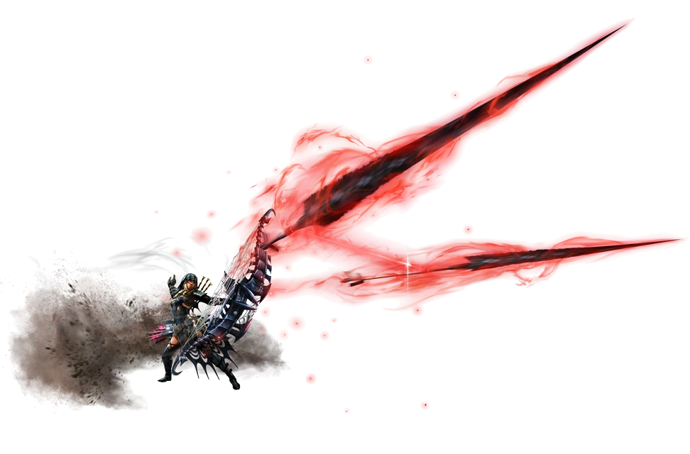 Ata dos flechas con alambre de acero para crear una hoja voladora al dispararlas. Toda flecha que no sea de disparo en arco o potente se cambia un tiempo por alambre. No admite revestimientos, pero corta colas de monstruo. | I | Aldea 2★ "Forajido a por todas" o Gremio 2★ "El rey de las montañas" |