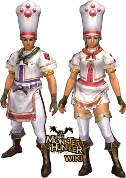 Devotion, Courage, and Love may be the ingredients for a great hunter, as well as a great chef. But this low level armor provides little to the hunt, and lacks slots for expansion on the skills. While this set seems incomplete without Gauntlets or Leggings, it does leave some room for the imagination. Its flexibility to be used by Blademasters or Gunners means any two useful armor pieces could fill the gap. Some critical thinking would have to go into considering what skills to add, and also how many extra slots you'll need for each(including your weapon). In the end, it's hard to judge it's usefulness beyond cooking some Gourmet Steaks for you and your teammates. While you may be able to grill up a mean Popo, the battlefield is no place for a chef.
