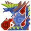 A purple body with berry red fur, green claws, markings, and horns which also have numerous small spikes poking out from between them, several small spikes on the end of the tail, and a large green fin on its back.