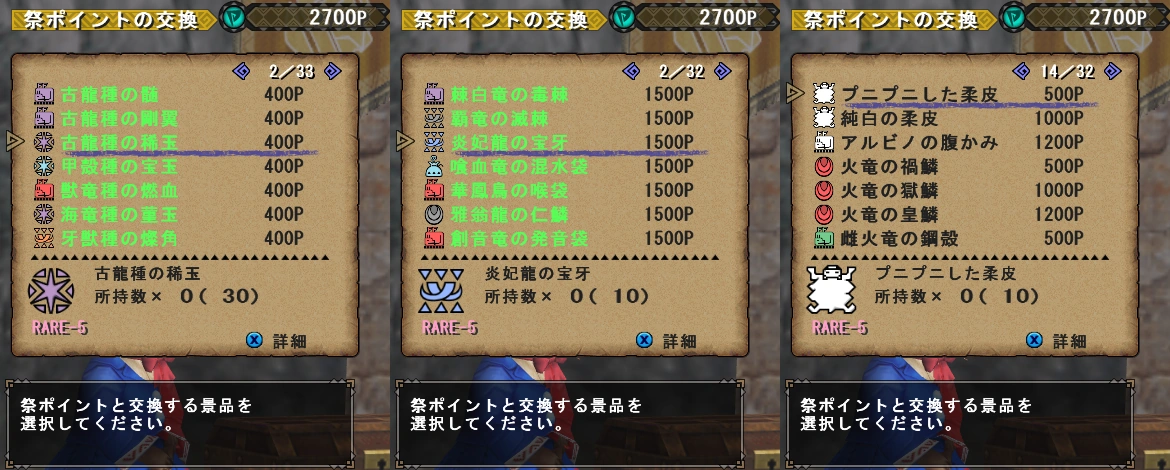 The Festival Shop offers a large variety of items in several categories. This includes food ingredients, collectibles from the field (gathering), common and rare monster materials, decoration jewels and even Hardcore and G Hardcore Carves.