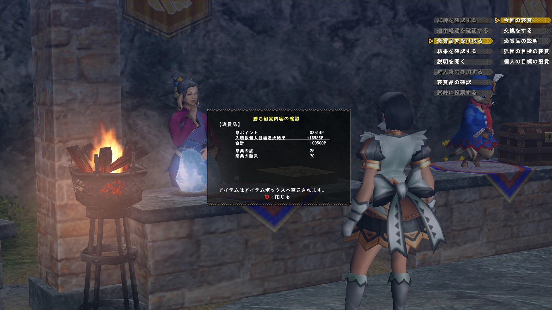 The second phase is the hunting week. During this week players can collect points by slaying or capturing monsters, as well as delivering certain carry-items (wyvern eggs, herbivore eggs, soothstone ore, powderstone, etc) and donate these to the Hunter Festival.
