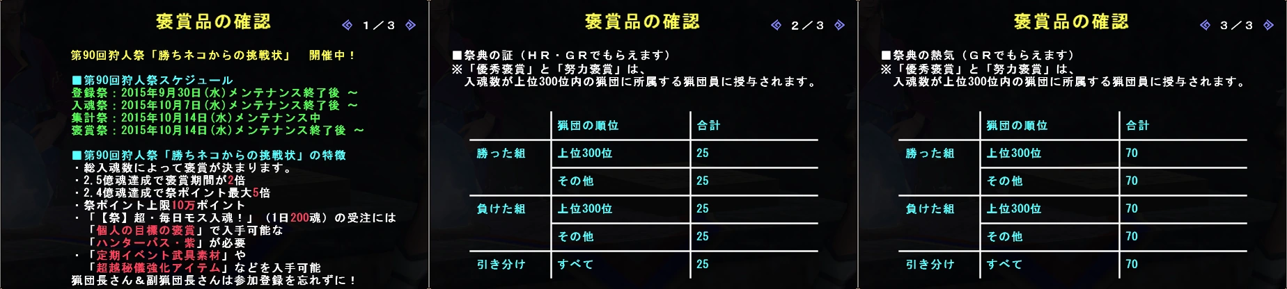 In the third and final week of the Hunter Festival, also known as the reward week, the combined total of Soul Points donated by both teams will have been calculated and compared, resulting in 1 team being declared as the winner. All participants who have donated will be able to claim rewards based on the amount of Soul Points they have turned in individually and as a Guild.