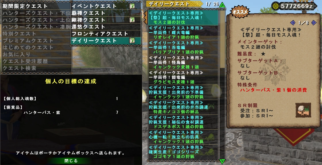 An example of a personal donation reward is the Purple Hunter Pass (ハンターパス・紫) which is required to access the "Slay 2 Mosswine" Daily Quest. This reward can be claimed after donating 1 Soul Point and the player will receive 7 Purple Hunter Passes to use on a Hunter Festival during the Hunting Week.