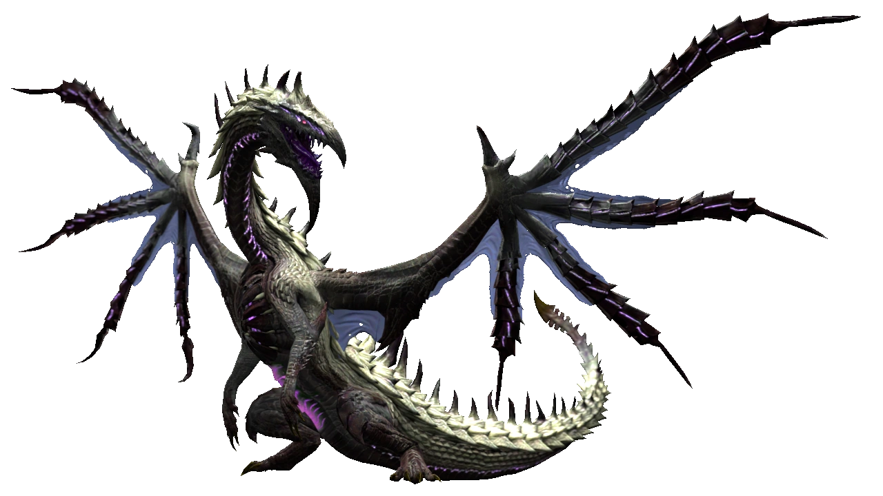 Merphistophelin is a pale white Elder Dragon whose physical appearance is very similar to that of Fatalis. Running along from it's head to it's tail rests a line of dark grey spines, trailing off from being shortest on the tail to larger barbs along the back of its neck. Its head is rather unusual, being somewhat avian and serpentine in appearance, while also sporting a prominent spike on its chin. This dragon's wings are also abnormal in their appearance, being almost devoid of any sort of membrane in between, yet this beast somehow retains the ability to fly. Its wing membrane appears when it enters one of its elemental states. On its chest is an assortment of rib-cage like barbs that normally stay closed around its purple chest cavity. These barbs will spring open during either of its states with the "core" in it changing to various colors depending on the state its in.