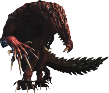 Odogaron is a quadrupedal fanged wyvern, capable of moving at fast speeds.Odogaron is covered in red scales and bony protrusions that resemble muscle tissue and bone. The tail is particularly bony and can be used as a club. Odogaron's most distinctive feature is its double row of claws, which it uses to inflict deep wounds in its prey. After eating, red veins will glow on its back.