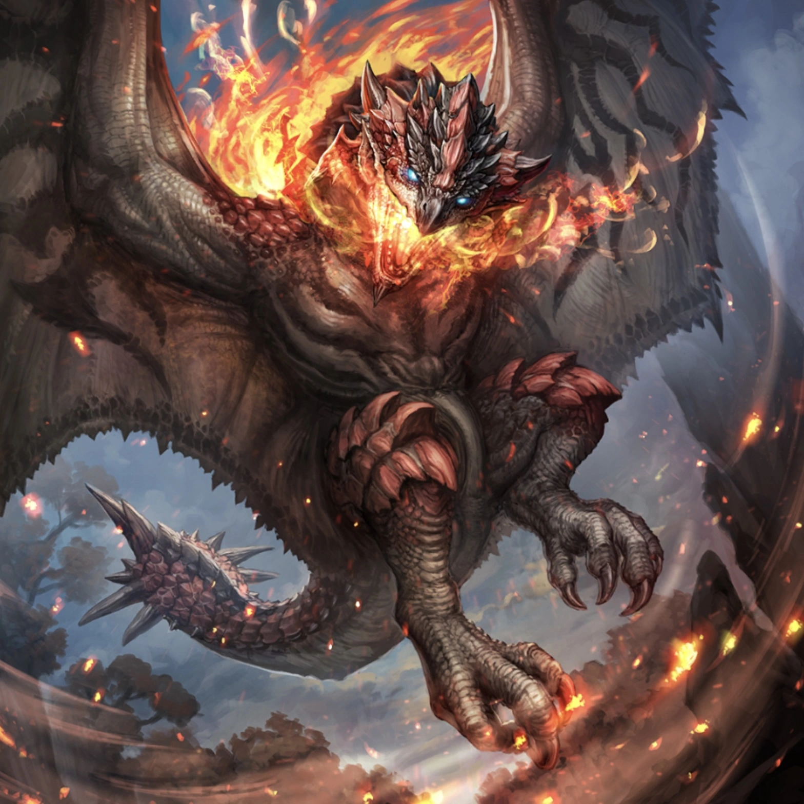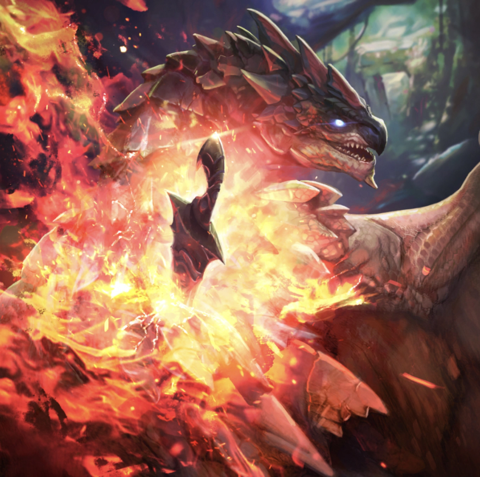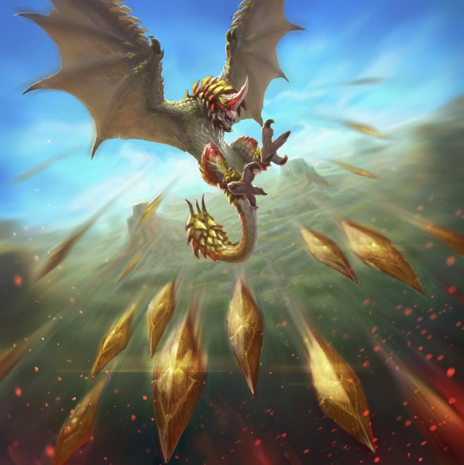 | Legendary Beast Alatreon | Alatreon | The torrent of flames was without parallel. The fire burned with such intensity that the very dust in the air was reduced to cinders, and the scene resembled a red snowstorm. | Type: Green Unit Cost: 8 MP Stats: 2 Attack/8 HP Effects: Spillover Attacking: Inflict Halt on 1 random enemy with an MP cost of 5 or less for 5 seconds. Death: Gain +2 MP. Unleash: 15 Gain +2 Attack, then deal damage to all enemy units equal to this unit's Attack. Set No: DTL 032 Secret |