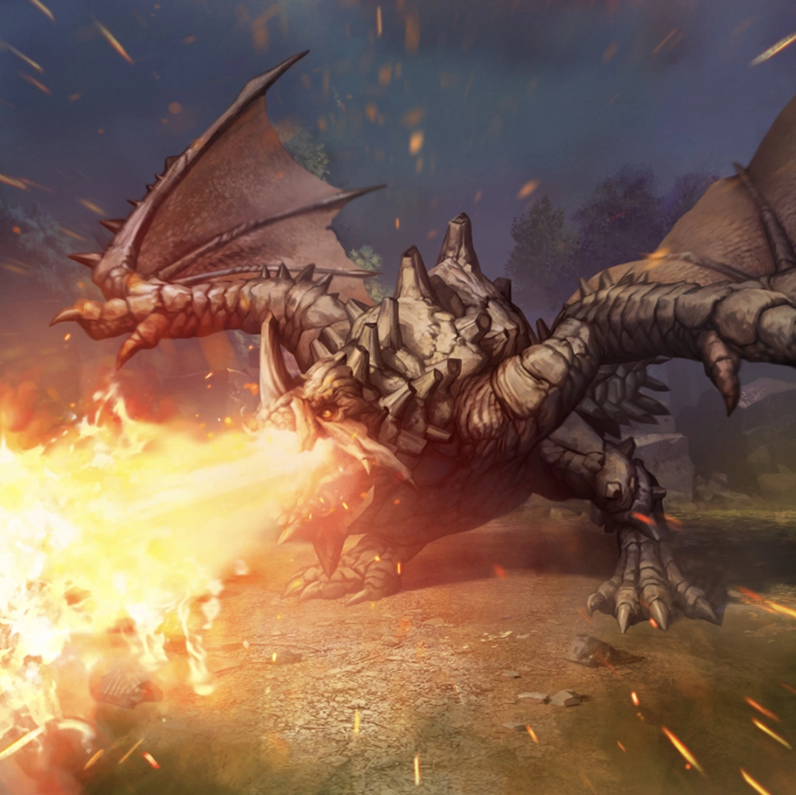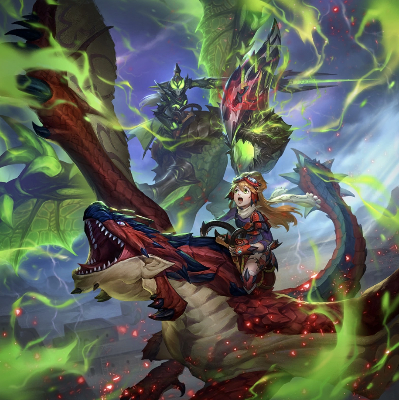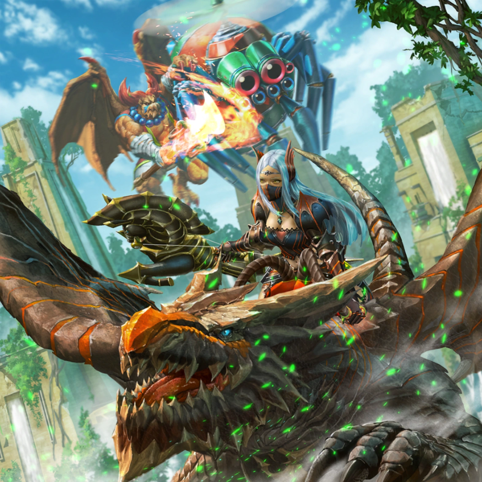 | Legendary Beast Alatreon | Alatreon | The torrent of flames was without parallel. The fire burned with such intensity that the very dust in the air was reduced to cinders, and the scene resembled a red snowstorm. | Type: Green Unit Cost: 8 MP Stats: 2 Attack/8 HP Effects: Spillover Attacking: Inflict Halt on 1 random enemy with an MP cost of 5 or less for 5 seconds. Death: Gain +2 MP. Unleash: 15 Gain +2 Attack, then deal damage to all enemy units equal to this unit's Attack. Set No: DTL 032 Secret |