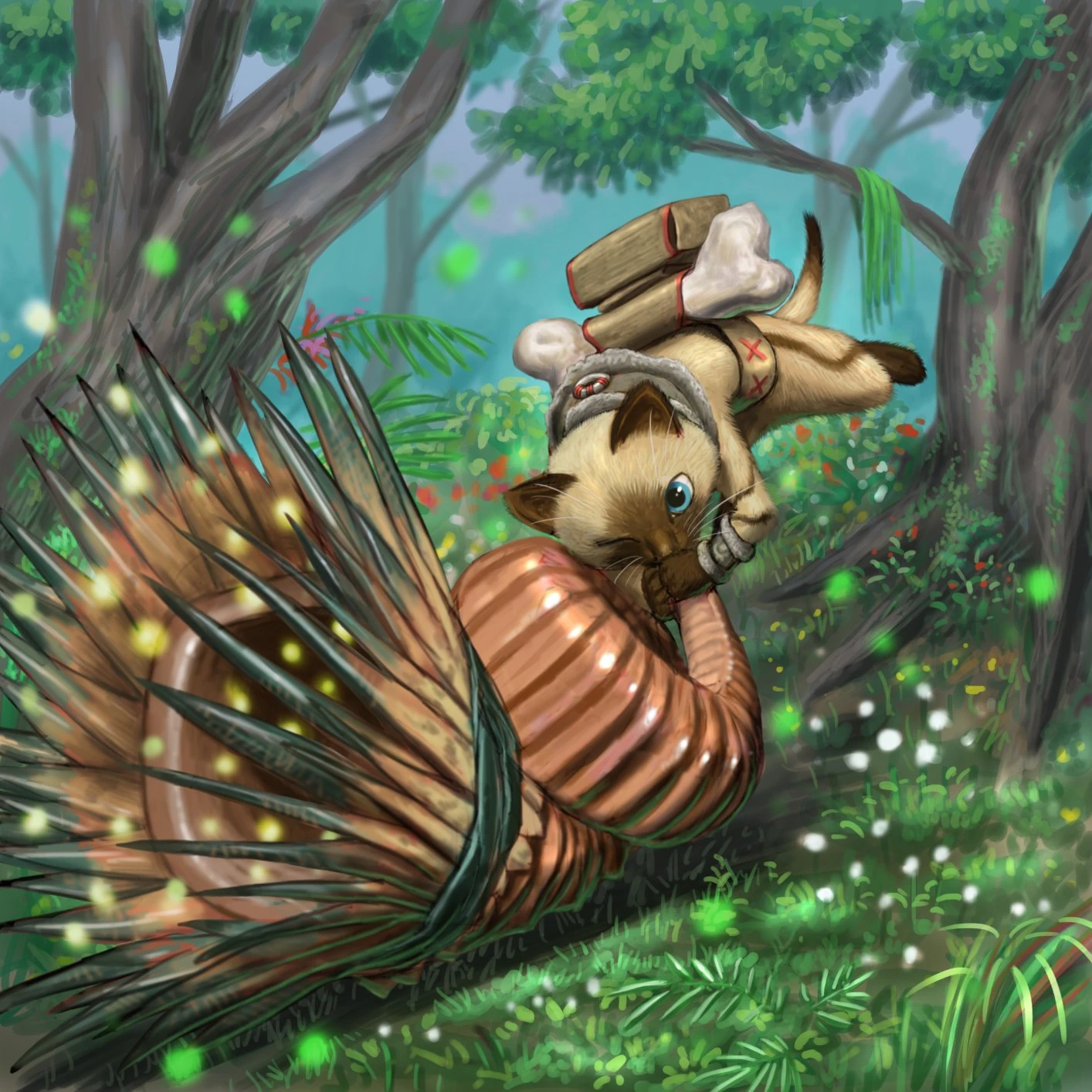 Ooh, I hate this one! I can't tell you how many times it's poked me in the purr-sterior. Not to mention how many times it's singed my tail! | Type: Green Unit Cost: 3 MP Stats: 2 Attack/3 HP Effects: When played: Other friendly Monster units gain +2 HP. Set No: FELYNE 004 |