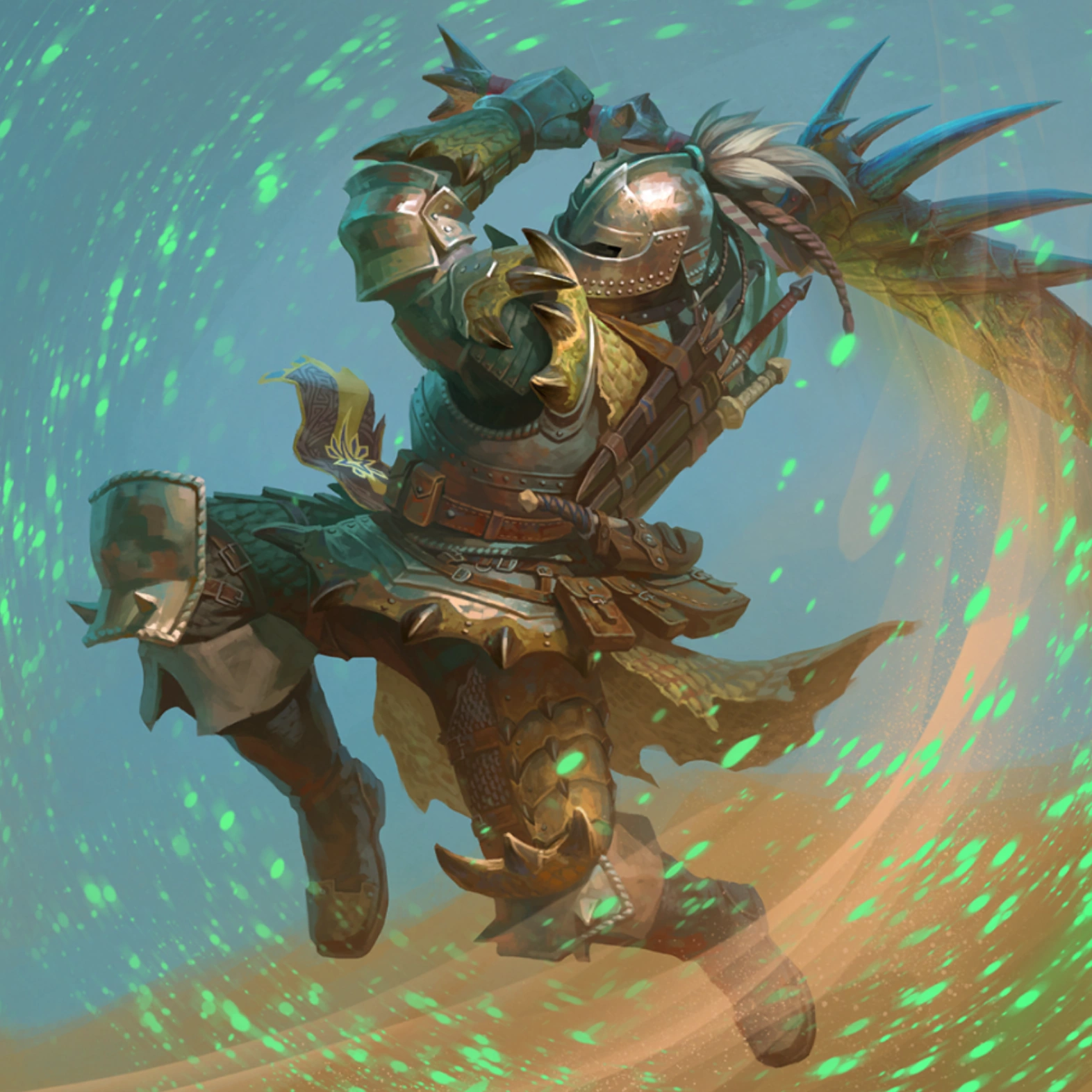 Even in the desert's glare, there was no revealing what lay in the darkness behind the creature's large mask, save for keen eyes in search of its enemies. The sword in its right hand beat a steady rhythm, ever ready. | Type: Red Unit Cost: 3 MP Stats: 2 Attack/5 HP Effects: When played: Explore for Hidden Knife (T034). Set No: DTL 007 |