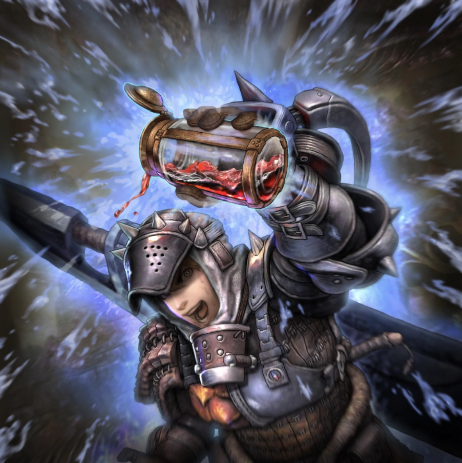 Hunters made this concoction to unleash their inner strength. Sometimes to destroy a monster, you must become one. | Type: Black Action Cost: 1 MP Effects: Sacrifices 2 Life. Give 1 friendly unit +1/+1. Set No: NERGIGANTE 010 |