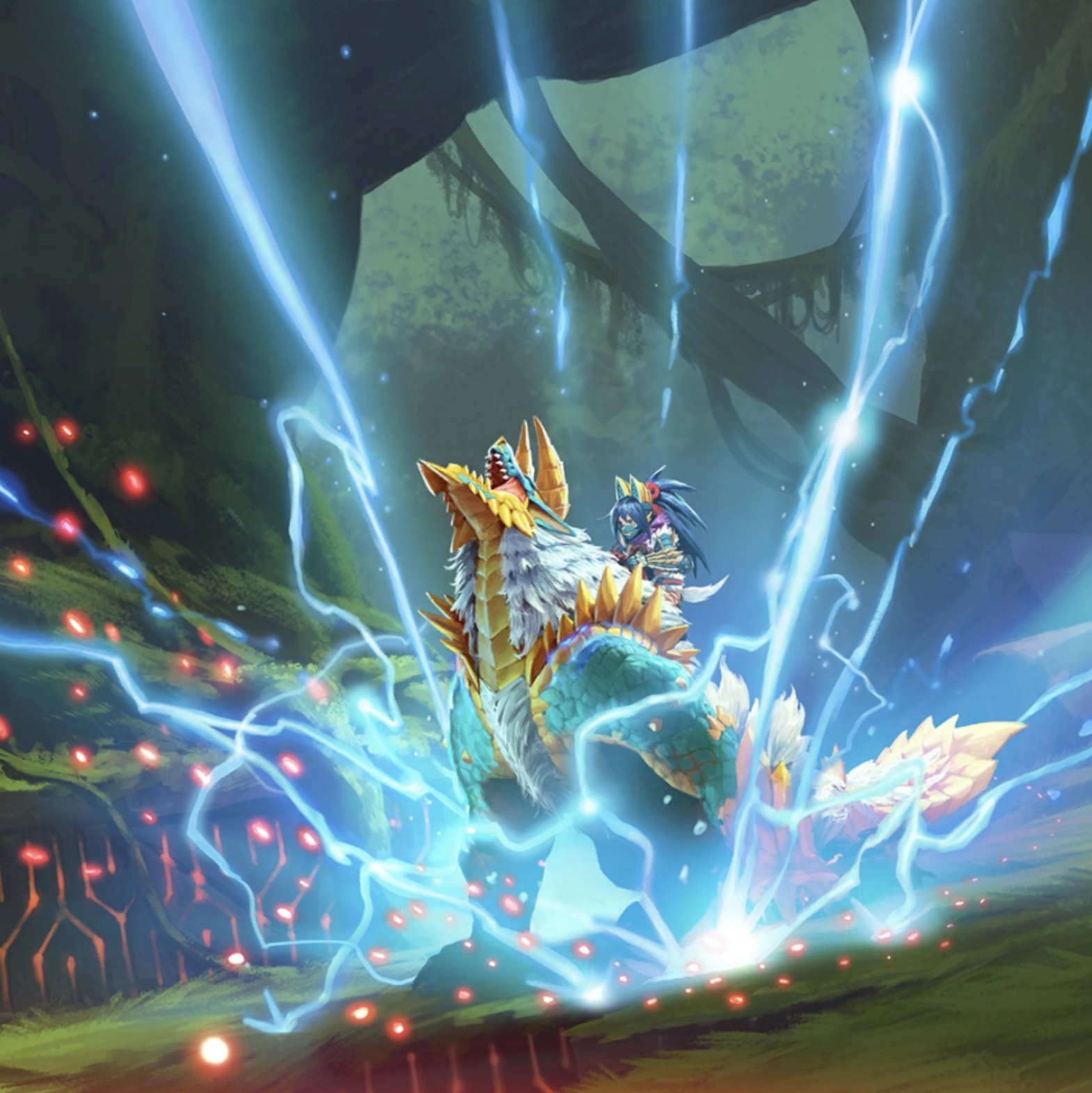 The wyvern howls at the moon after discharging an electrical torrent into the river, lighting up the night. | Type: Red Action Cost: 3 MP Effects: Give 1 friendly red unit +2 Attack. Set No: RATHALOS 012 |