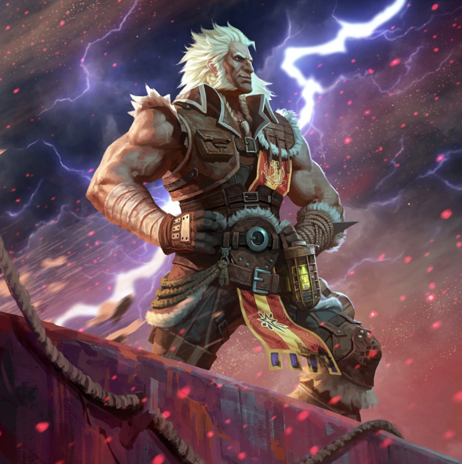 The storm lashed at the burly veteran, leaving his ears ringing. Yet still he kept a steely eye trained on the roiling tempest, reading its currents to overcome the Desert of Death. | Type: Red Unit Cost: 9 MP Stats: 4 Attack/12 HP Effects: Rush This unit cannot counter. After taking damage and surviving: Deal 7 damage to 1 random enemy unit. Set No: BOR 083 |