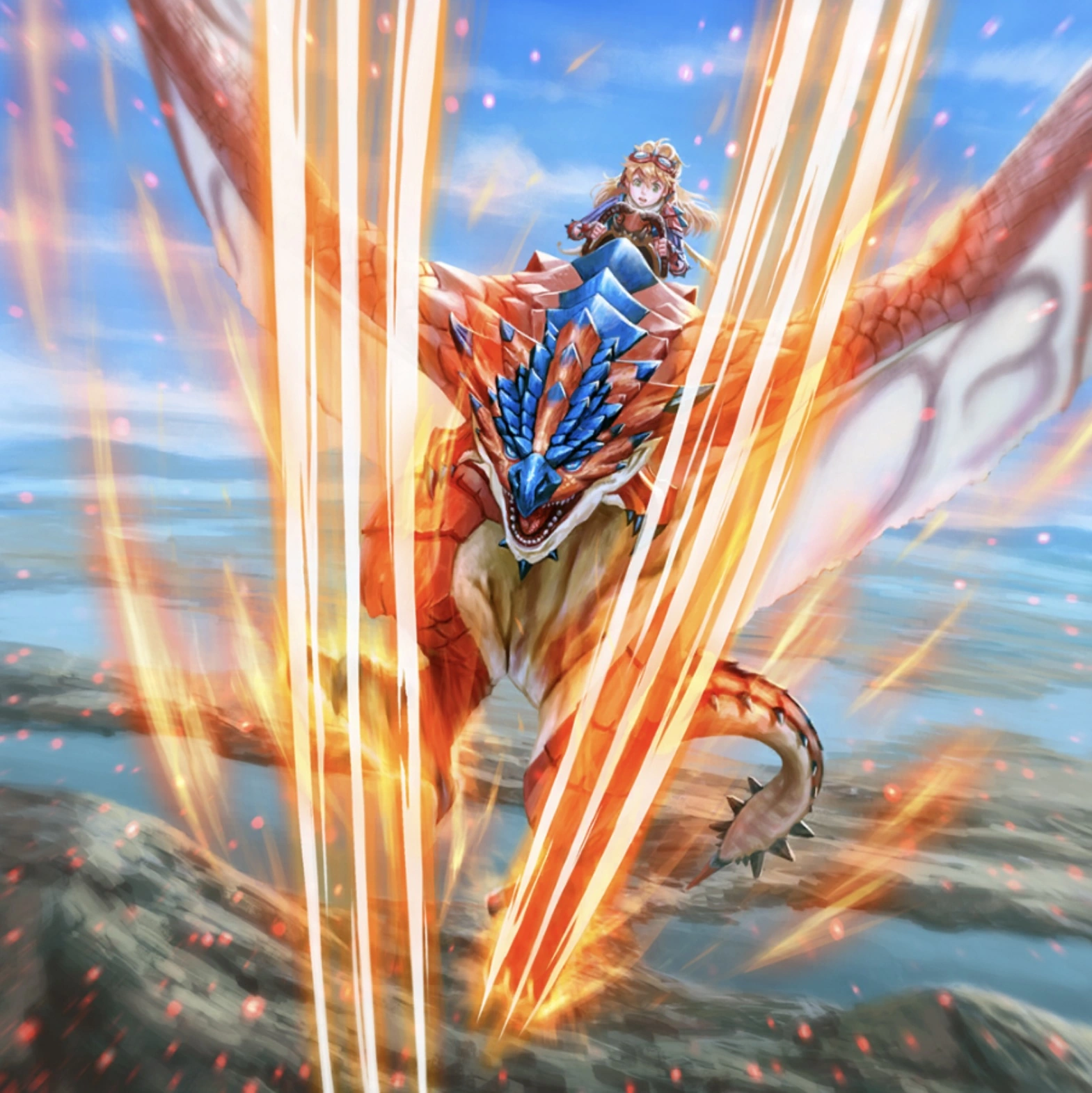Its wings beating against its back, the fire wyvern tilted its head and roared, finding new strength inside. | Type: Red Action Cost: 2 MP Effects: Give 1 friendly red unit +2 Attack. (Effective for 1 attack.) Set No: RATHALOS 010 |