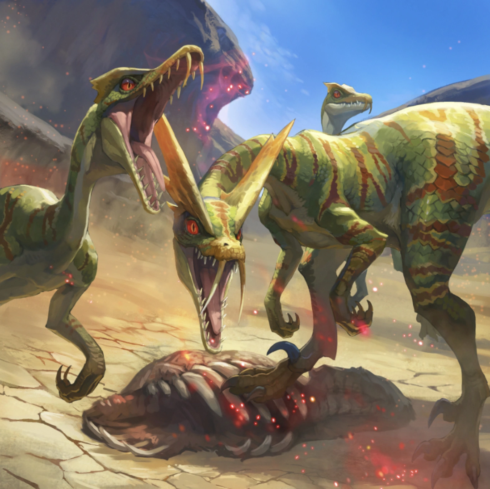 The pack of wyverns surrounded their prey in an instant, their natural teamwork turning them into predators. | Type: Red Action Cost: 3 MP Effects: Give all friendly red units +2 Attack. (Effective for 1 attack.) Set No: RATHALOS 011 |