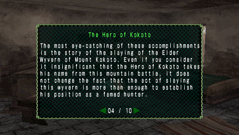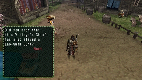 Also after completing the Lao quest if the player speak to the female NPC who have a basket on her head she'll have dialogue telling the player that the Chief also once slayed a Lao-Shan by himself. Also to mention, the player will unlock a in-game book called "The Hero of Kokoto" after completing the village urgent Rathalos quest, it will mentioned a Elder Wyvern(Before Gen. 2 MH games labeling the Elder monsters like Kirin, Lao, & Fatalis them as a "Elder Dragon", on Gen. 1 they were known as a "Elder Wyvern".) slaughtered his fiancee.